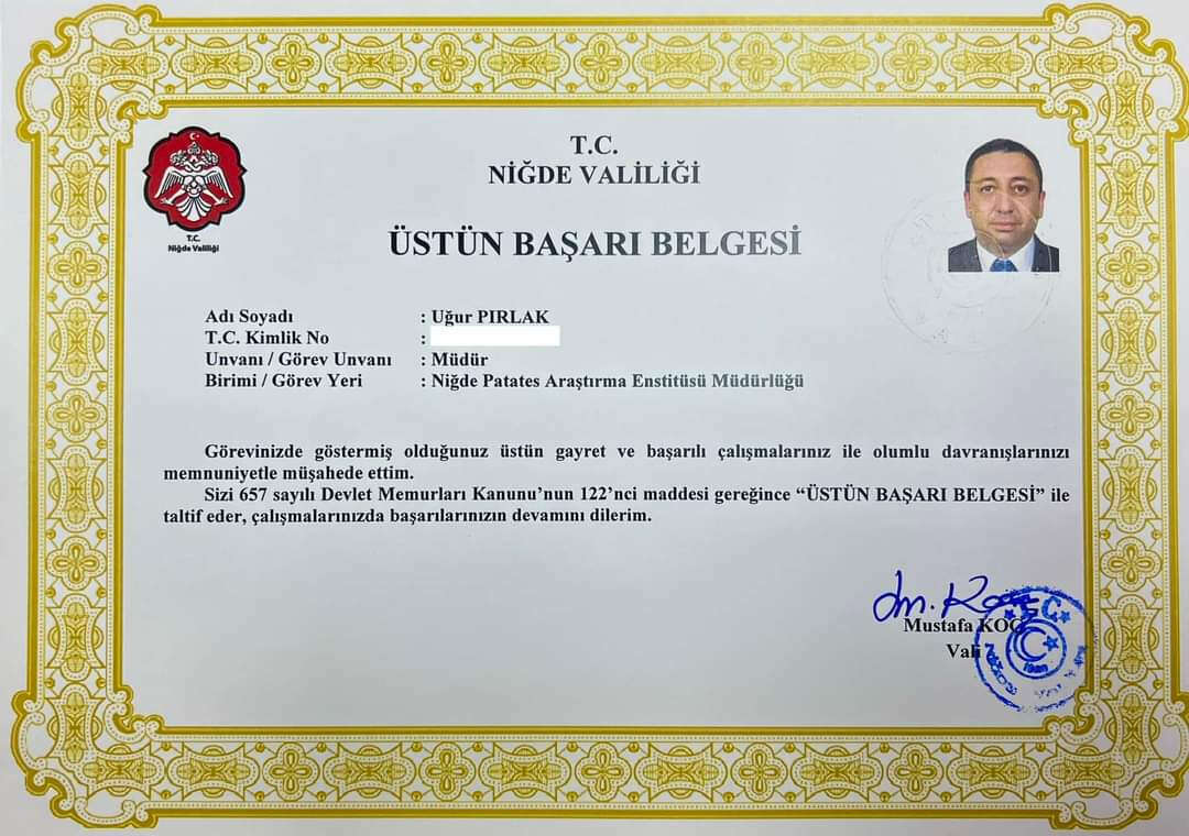 Niğde Patates Araştırma Enstitüsü Müdürü Uğur Pırlak, yerli ve milli patates tohumu üretiminde yaptığı çalışmalardan ötürü Niğde Valisi Mustafa Koç tarafından "Üstün Başarı Belgesi" ile ödüllendirildi.