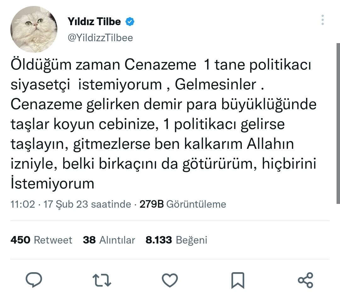 Yıldız Tilbe" Öldüğüm zaman cenazemde bir tane politikacı siyasetçi istemiyorum" diyerek şunları ekledi: "Gelmesinler. Cenazeme gelirken demir para büyüklüğünde taşlar koyun cebinize, 1 politikacı gelirse taşlayın, gitmezlerse ben kalkarım Allah'ın izniyle, belki birkaçını da götürürüm, hiçbirini istemiyorum."