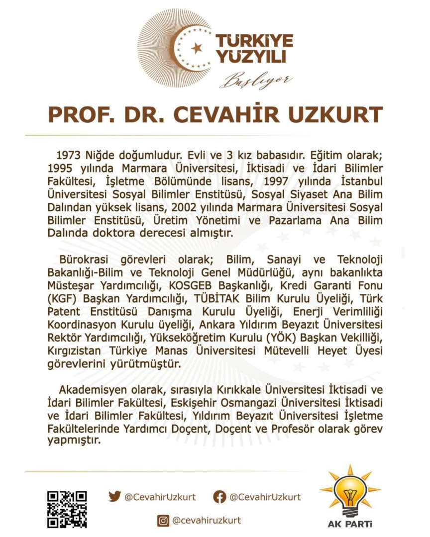 Prof. Dr. Cevahir Uzkurt açıklamasında şu ifadeleri kullandı; "Yükseköğretim Kurulu (YÖK) Başkan Vekilliğinden 28. dönem milletvekili seçimleri için istifa etmiş bulunuyorum. Bu süreçte birlikte çalıştığımız yükseköğretim camiasının değerli mensuplarına şükranlarımı sunuyorum.