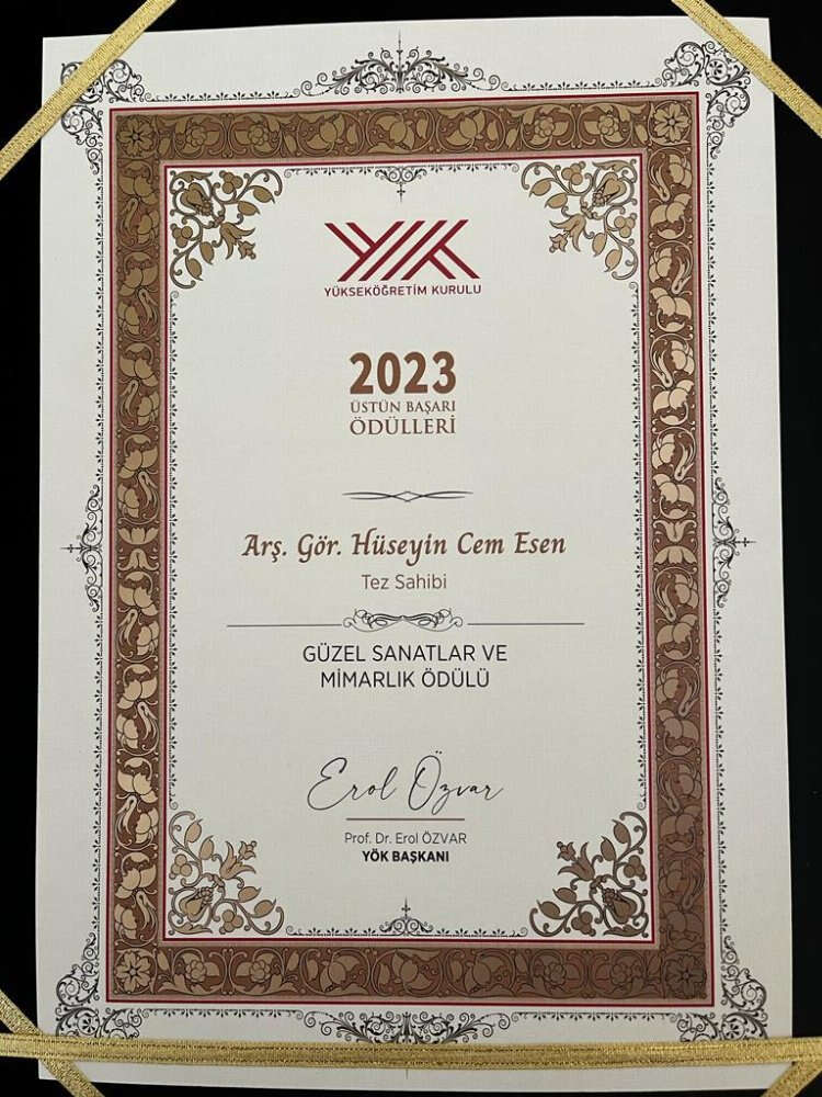 Niğde Ömer Halisdemir Üniversitesi'nde görev yapan Öğretim Elemanı Araş. Gör. Drç Hüseyin Cem Esen, Prof. Dr. Sevilay Çınar ve Prof. Dr. Okan Murat Öztürk’ün danışmanlığında hazırladığı "Yeni Platonculuğun Osmanlı Mûsikî Nazariyatı Modelleri Üzerindeki Etkileri" başlıklı doktora teziyle almaya hak kazandığı ödülünü, Cumhurbaşkanlığı Külliyesi’nde gerçekleşen 2023 Akademik Yıl Açılış Töreni’nde Cumhurbaşkanı Recep Tayyip Erdoğan’ın elinden aldı.