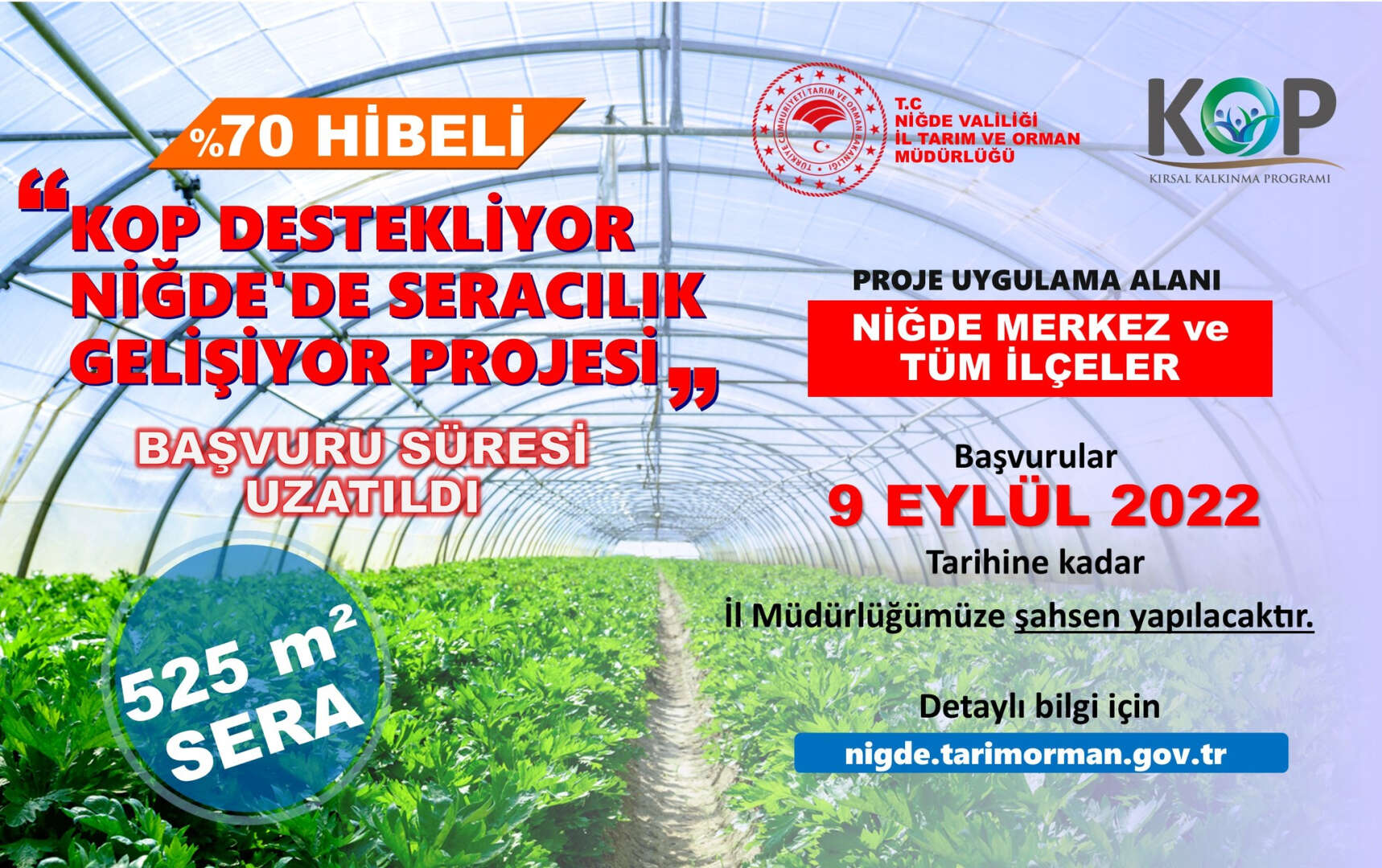 Niğde İl Tarım ve Orman Müdürlüğü tarafından hazırlanan ve Konya Bölge Kalkınma İdaresi Başkanlığı Kırsal Dezavantajlı Alanlarda Kalkınma Programı kapsamında desteklenen "KOP DESTEKLİYOR NİĞDE'DE SERACILIK GELİŞİYOR" Projesi kapsamında %70 hibe desteği ile Niğde Merkez, İlçelerinde 525'er metrekare sera kurulumu yapılacak.