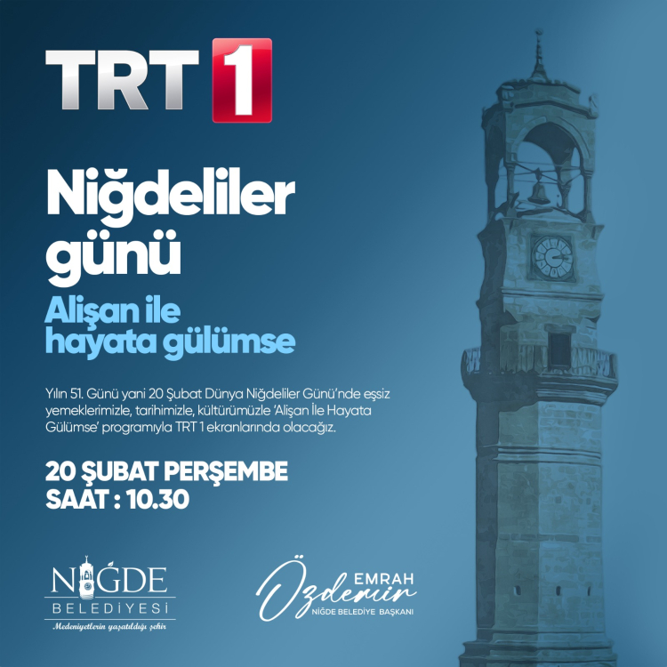 Her yılın 51. gününde kutlanan Dünya Niğdeliler Günü, bu yıl da coşkuyla kutlanıyor. Bu sene TRT 1 ekranlarında Alişan'ın sunduğu ''Alişan İle Hayata Gülümse'' programında kutlanan Dünya Niğdeliler Günü'nde, Niğde'nin yöresel tatları ve ürünleri, Niğde kültürüne ait maniler ve türküler seslendiriliyor. Niğde'den TRT 1 ekranlarına katılan tiyatro ve halk oyunu ekipleri, Niğde'nin yerel kültürüne ait değerleri canlı yayında izleyicilere aktarıyor.
