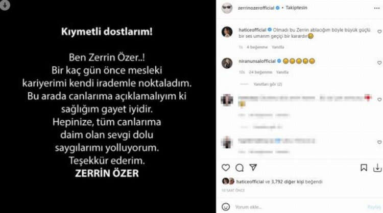 Sosyal medya platformu Instagram hesabından paylaşım yapan Zerrin Özer, "Kıymetli dostlarım. Birkaç gün önce mesleki kariyerimi kendi irademle noktaladım. Bu arada canlarıma açıklamalıyım ki sağlığım gayet iyidir. Hepinize, tüm canlarıma saygılarımı yolluyorum. Teşekkür ederim" dedi.