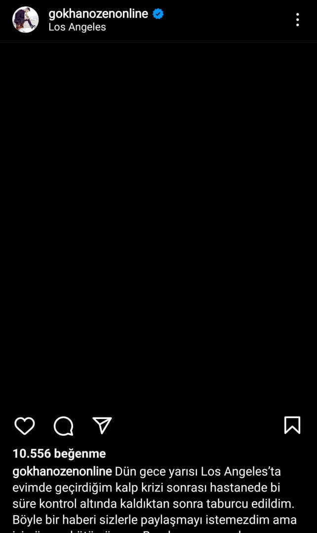 1 milyon 200 takipçili instagram hesabından yaptığı duyuruda hastalığı hakkında açıklama yapan Gökhan Özen; "Dün gece yarısı Los Angeles’ta evimde geçirdiğim kalp krizi sonrası hastanede bi süre kontrol altında kaldıktan sonra taburcu edildim. Böyle bir haberi sizlerle paylaşmayı istemezdim ama iyi gün var, kötü gün var. Bundan sonrasında kontrollere devam edip stresten uzak çok sakin bir hayat yaşamayı planlıyorum. Allaha emanet" ifadelerini kullandı.