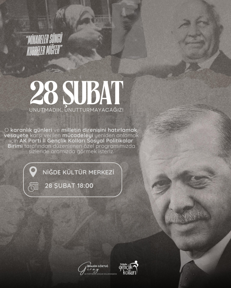 AK Parti Niğde'de 28 Şubat programı düzenleyecek. Konuyla ilgili açıklama yapan AK Parti Niğde Gençlik Kolları Başkanı İbrahim Göktuğ Giray, ''Türkiye’nin demokrasi tarihine kara bir leke olarak geçen 28 Şubat sürecini ve milletimizin onurlu direnişini yeniden anlamak için bu programı düzenliyoruz'' dedi. Program, 28 Şubat Cuma günü saat 18.00'da Niğde Kültür Merkezi'nde gerçekleştirilecek.