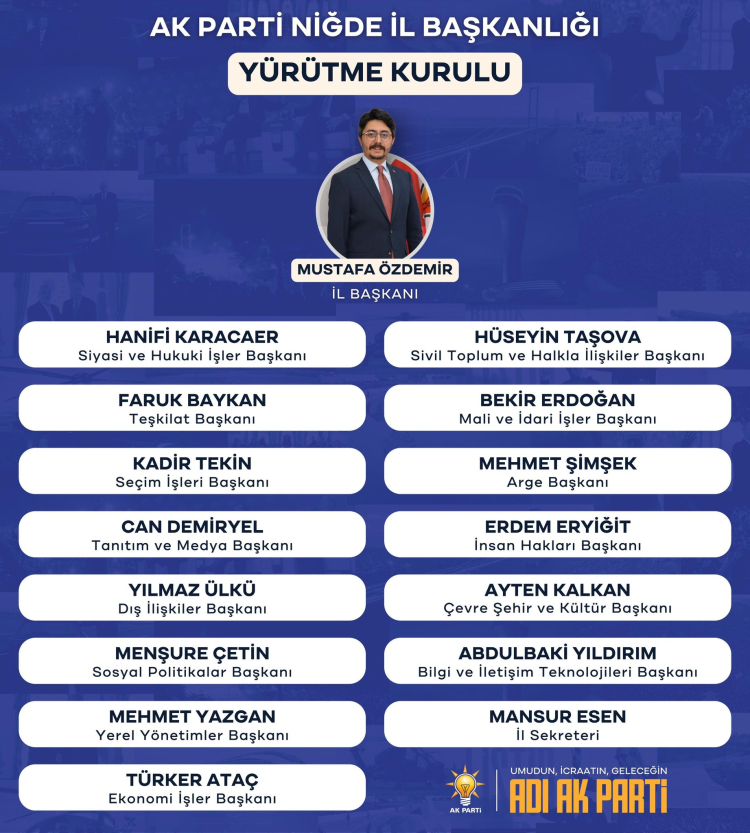 Dışişleri Bakanı Hakan Fidan ve AK Parti Grup Başkanvekili Leyla Şahin Usta'nın katılımıyla 5 Ocak 2025'te yapılan AK Parti Niğde 8 . Olağan İl Kongresi sonucu yeniden AK Parti Niğde İl Başkanı seçilen Mustafa Özdemir, yönetim kadrosunu belirledi. Buna göre,