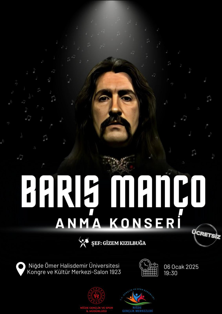 Anadolu rock müziğinin öncü ismi ve dünya çapında ün yapmış sanatçı Barış Manço, Niğde Ömer Halisdemir Üniversitesi Kampüs Genç Ofis Korosu’nun hazırladığı konserle anılacak. Barış Manço'yu Anma Konseri, 6 Ocak 2025 Cumartesi günü saat 19:30’da NÖHÜ Kongre ve Kültür Merkezi, Salon 1923’te gerçekleştirilecek. Etkinlikte Barış Manço’nun unutulmaz eserleri seslendirilecek.