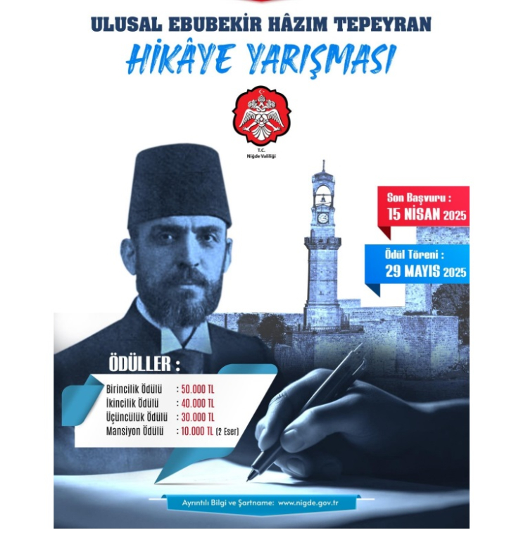Osmanlı Devleti'nde dahiliye nazırlığı, cumhuriyet döneminde de milletvekilliği görevi yapan Niğdeli devlet adamı ve edebiyatçı Ebubekir Hâzım Tepeyran’ın adını yaşatmak ve gelecek kuşaklara aktarmak amacıyla hikaye yarışması düzenlenecek. Niğde Valiliği koordinesinde düzenlenecek olan yarışmaya 15 yaşını doldurmuş tüm vatandaşların yanı sıra, yurt içi ve yurt dışından başvurular da alınacak.