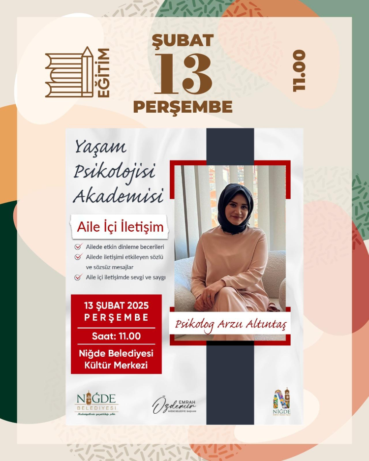 Niğde Belediyesi Kültür ve Sosyal İşler Müdürlüğü, sosyal sorumluluk projeleri kapsamında başlattığı Yaşam Psikolojisi Akademisi ile vatandaşlara psikolojik ve sosyal alanda rehberlik etmeye devam ediyor. Akademi, ilk olarak aile içi iletişim konusuyla kapılarını açıyor. 13 Şubat Perşembe günü saat 11.00'de Niğde Belediyesi Kültür Merkezi'nde gerçekleştirilecek etkinliğin konuğu ise alanında uzman Psikolog Arzu Altıntaş olacak.