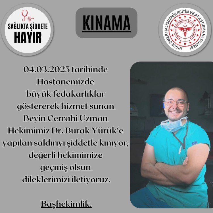 Niğde Ömer Halisdemir Üniversitesi Eğitim ve Araştırma Hastanesinde görevli Beyin Cerrahı oalrak görev yapan Uzm. Dr. Burak Yörük'e bir hastası, bıçaklı saldırıda bulundu.