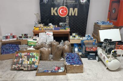 71 bin 100 adet doldurulmuş makaron, 39 bin 400 adet boş makaron, 59 adet 125 gr.’lık nargile tütünü, 4 adet elektrikli kompresörlü sigara basma makinası, 1 adet kompresör, 70 kilo tütün ele geçirildi.