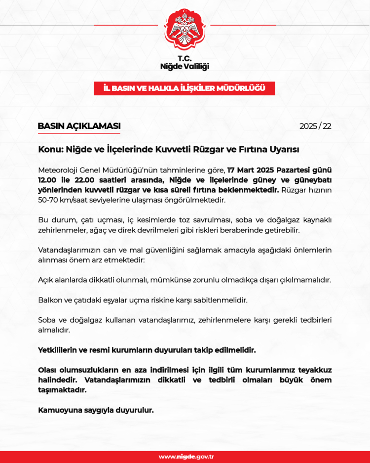 Niğde'de bugün (27 Mart Pazartesi) öğle saatlerinden itibaren gece saatlerine kadar etkili olacağı tahmin edilen fırtınanın, güney ve güneybatı yönlerinden eseceği ve 50-70 kilometre kuvvete ulaşabileceği aktarıldı. Niğde Valiliği tarafından yapılan uyarıda, rüzgarın çatı uçması, iç bölgelerde toz kalkması, soba ve doğalgazla ilgili zehirlenmelerin yanı sıra ağaç ve direklerin devrilmesi gibi tehlikelere sebep olabileceği belirtildi. Açıklamada, vatandaşların can ve mal güvenliğini sağlamak amacıyla açık alanlarda daha dikkatli olmaları, mümkünse zorunlu olmadıkça dışarı çıkmamaları, balkon ve çatıdaki eşyaların uçma riskine karşı sabitlenmesi, soba ve doğalgaz kullanan kişilerin ise zehirlenmelere karşı gerekli önlemleri alması gerektiği ifade edildi.