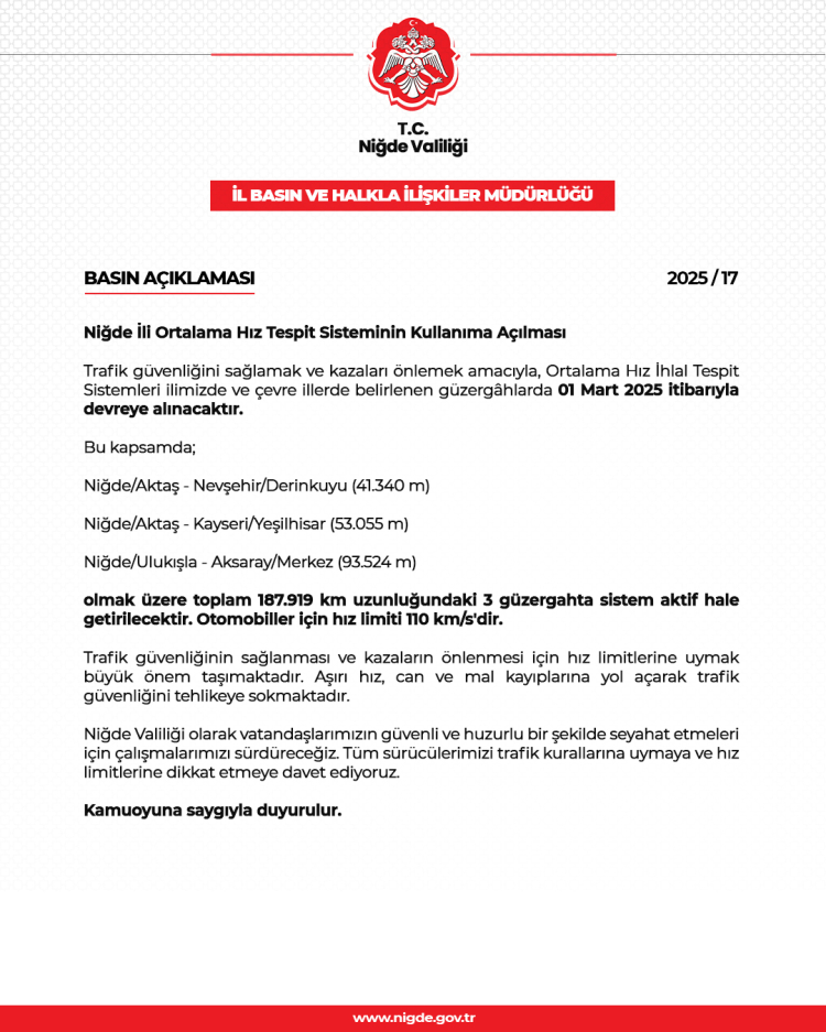 Niğde Valiliği, il genelinde ve çevre illerle bağlantılı yollarda trafik güvenliğini artırmak ve kazaların önüne geçmek için Ortalama Hız İhlal Tespit Sistemini devreye alacağını açıkladı. Sistemin 1 Mart 2025 tarihinde uygulanmaya başlanacağı ve üç güzergah üzerinde aktif olacağı belirtildi. Toplam 187 bin 919 km uzunluğundaki bu yollarda, otomobiller için hız sınırı 110 km/s olarak belirlendi. Niğde Valiliği tarafından yapılan açıklamada, "Trafik güvenliğinin sağlanması ve kazaların önlenmesi için hız limitlerine uymak gereklidir. Aşırı hız, ciddi can ve mal kayıplarına neden olarak trafik güvenliğini riske atmaktadır. Niğde Valiliği olarak, halkımızın güvenli ve huzurlu bir yolculuk yapması amacıyla çalışmalarımızı sürdüreceğiz. Tüm sürücülerimizi trafik kurallarına uymaya ve hız sınırlarına dikkat etmeye davet ediyoruz" denildi. Sistemin uygulanacağı güzergâhlar ise şöyle: