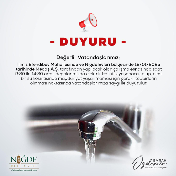 Niğde'de MEDAŞ A.Ş.'nin elektrik çalışmaları nedeniyle su depolarında oluşabilecek elektrik kesintilerinin su kesintilerine de yol açabileceğini belirten Niğde Belediyesi, vatandaşları uyardı. Yapılan duyuruda: ''İlimiz Efendibey Mahallesi ve Niğde Evleri bölgesinde 18/01/2025 tarihinde Medaş A.Ş. tarafından yapılacak olan çalışma esnasında saat 9.30 ile 14.30 arasında depolarımızda elektrik kesintisi yaşanacak olup, olası bir kesintide mağduriyet yaşanmaması için gerekli tedbirlerin alınması için vatandaşlarımıza saygıyla duyurulur'' ifadeleri kullanıldı.