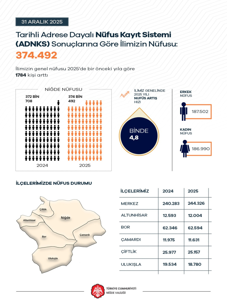 Açıklanan verilere göre Niğde’nin nüfusu bir önceki yıla kıyasla 1.784 kişi arttı. Kentte yıllık nüfus artış hızı ise binde 4,8 olarak kaydedildi.