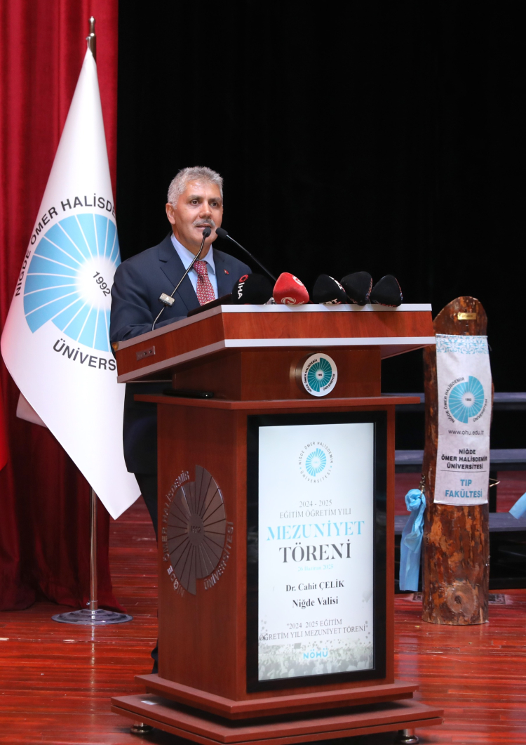 “Bugün, Ömer Halisdemir’in adını gururla taşıyan üniversitemizin en onurlu günlerinden birini yaşıyoruz.” diyen Uslu, üniversitenin eğitim, sağlık, tarım, sürdürülebilirlik ve araştırma alanlarında önemli ilerlemeler kaydettiğini vurguladı. Rektör Uslu, konuşmasında özellikle Diş Hekimliği ve Tıp Fakültelerinin sağlık hizmeti ve eğitim alanındaki başarılarına dikkat çekerek, “Diş Fakültemiz eğitim kliniği olma hakkı kazandı, hastanemiz sağlık turizmi yetki belgesi aldı. Tıp Fakültemiz ise TUS puanına göre Türkiye’de ilk 10’da yer aldı.” dedi.