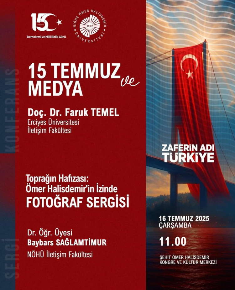 Niğde Ömer Halisdemir Üniversitesi (NÖHÜ) İletişim Fakültesi Öğretim Üyesi Dr. Baybars Sağlamtimur'un kadrajından ''Toprağın Hafızası: Ömer Halisdemir'in İzinde'' isimli fotoğraf sergisi, kapılarını açıyor. NÖHÜ Şehit Ömer Halisdemir Kongre ve Kültür Merkezinde düzenlenecek olan sergide, 15 Temmuz hain darbe girişiminin seyrini değiştiren kilit isim Piyade Astsubay Kıdemli Başçavuş Ömer Halisdemir'in yaşam döngüsüne odaklanılacak. Bu anlamda Türkiye'de ilk olma özelliği taşıyan sergi aynı zamanda fotoğraf sanatından da çeşitli teknikleri içinde barındıracak. 16 Temmuz (bugün) saat 11.00'da açılacak olan sergiye yoğun ilgi bekleniyor.