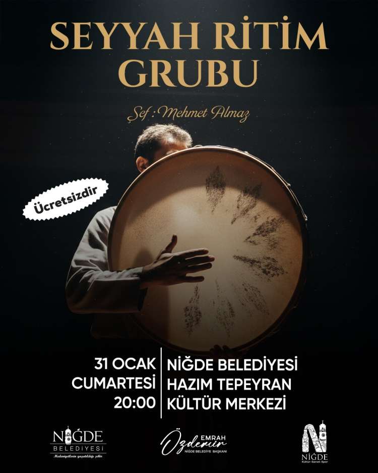 Niğde Belediyesi, şehrin kültürel hayatına dinamizm katan etkinliklerine bir yenisini daha ekliyor. "Ritmin izinde bir yolculuk" temasıyla düzenlenecek olan konserde, Şef Mehmet Almaz yönetimindeki Seyyah Ritim Grubu Niğdeli sanatseverlerle buluşacak. Geleneksel ve modern ezgilerin harmanlanacağı gecede, dinleyicileri müzik dolu, keyifli bir akşam bekliyor.