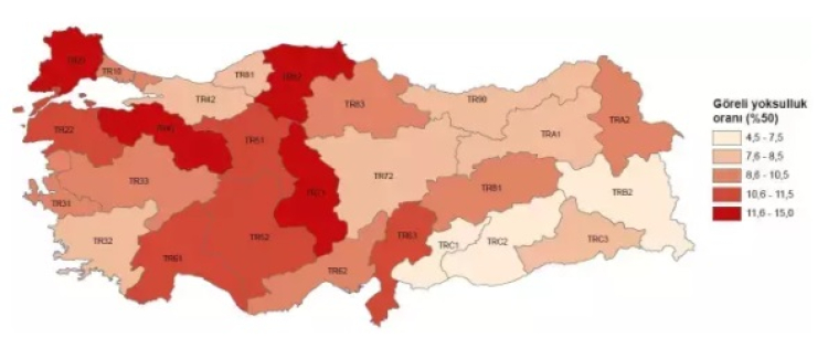Raporda, gelire dayalı göreli yoksulluk oranının en yüksek olduğu bölgeler; %14,6 ile Kırıkkale, Aksaray, Niğde, Nevşehir ve Kırşehir bölgeleri oldu. Geçtiğimiz yıl yayınlanan raporda Türkiye'nin en yoksul şehirleri Kastamonu, Çankırı ve Sinop illeri olmuştu. Bu yıl Niğde bu konuda bir basamak atlayarak liste başında yer aldı.