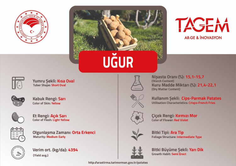 2023 yılında sanayilik (Cips ve Parmak Patates) kullanımına uygun olarak tescil başvurusu yapılan yeni çeşit, 15 Nisan 2025 tarihinde Ankara Tohumluk ve Tescil Sertifikasyon Müdürlüğü’nde gerçekleştirilen Endüstri Bitkileri (Patates) Tescil Toplantısında “Uğur” adıyla tescillendi. Böylece Enstitü tarafından tescil edilen yerli ve milli patates çeşitlerinin sayısı 11’e ulaşmış oldu.