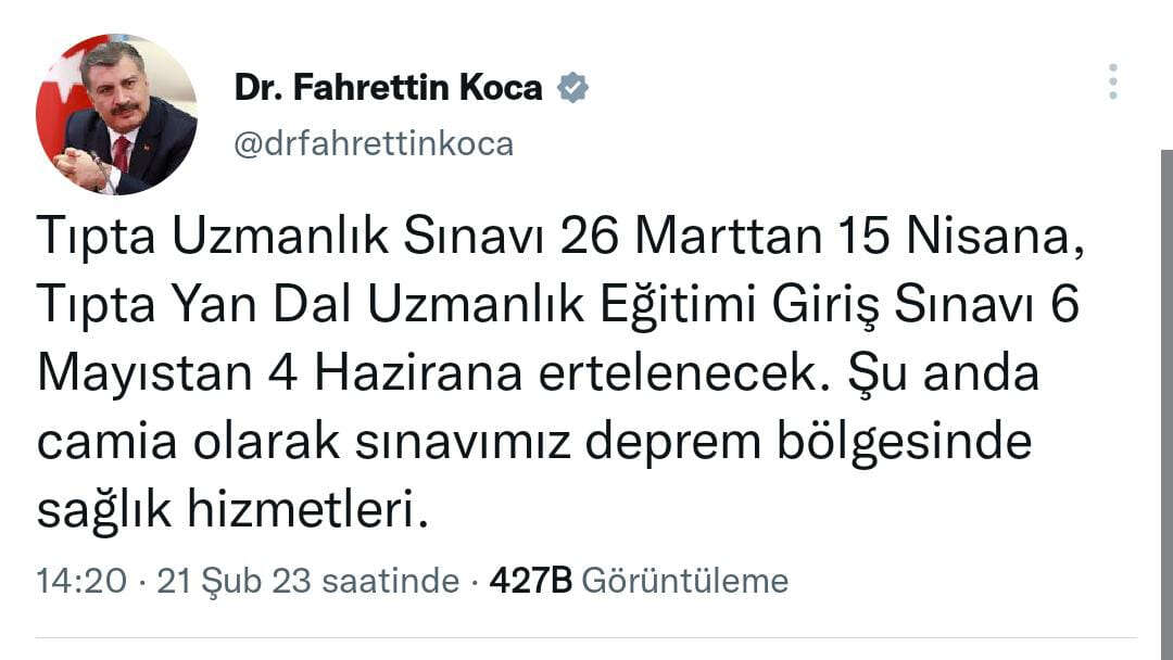 Bakan Koca sosyal medya hesabından yaptığı duyuruda “Tıpta Uzmanlık Sınavı 26 Mart’tan 15 Nisan’a,Tıpta Yan Dal Uzmanlık Eğitimi Giriş Sınavı 6 Mayıs’tan 4 Hazirana ertelenecek. Şu anda camia olarak sınavımız deprem bölgesinde sağlık hizmetleri.” dedi.