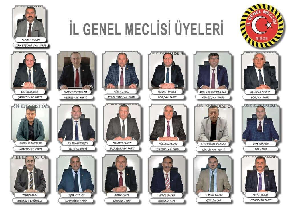 Niğde İl Genel Meclisinde AK Parti mecliste 12, Milliyetçi Hareket Partisi (MHP) 3, Cumhuriyet Halk Partisi (CHP) 2 ve İYİ Parti'den 1 üye ile yer alıyor. MHP'den ayrılan Tahsin Eren ile birlikte toplam 19 meclis üyesi yer alıyor.