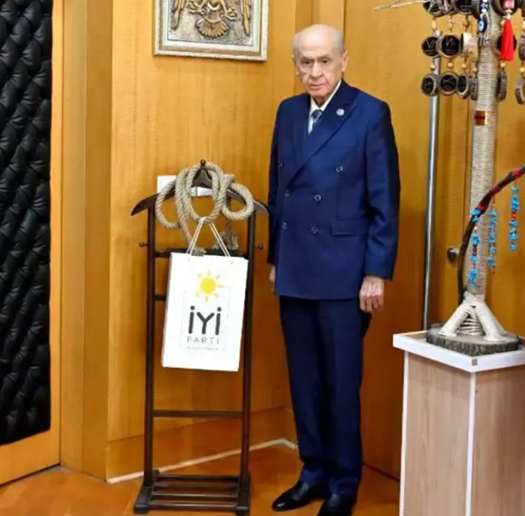 MHP’nin sosyal medya hesabından yapılan açıklamada, “İYİ Parti grup toplantısında Genel Başkanımız Devlet Bahçeli’ye makam odasına koyması gerekçesiyle atılan ipi aldık. Genel Başkanımız Devlet Bahçeli, ipi makam odasına astı” denildi.