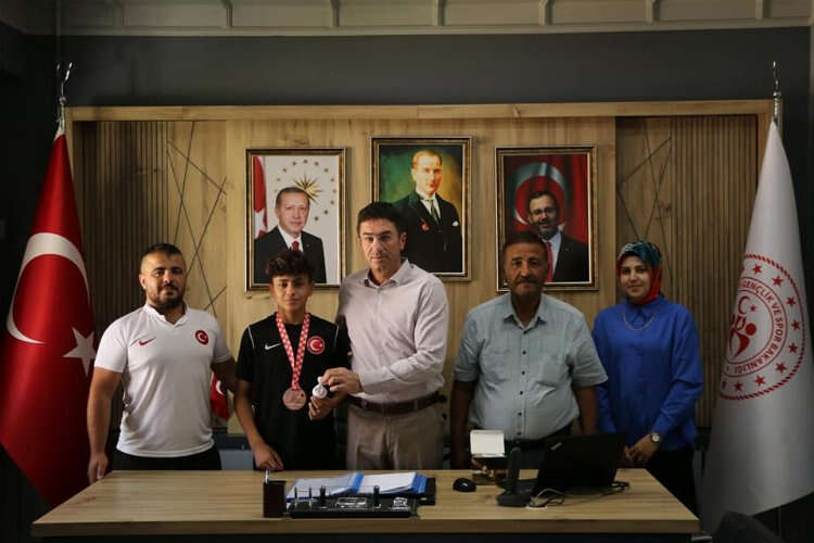 Gençlik ve Spor İl Müdürü İlker Ötgünlü'nün ağırladığı güreş sporcusu Samet Uçar hediyesini İl Müdürü Ötgünlü'nün elinden aldı.