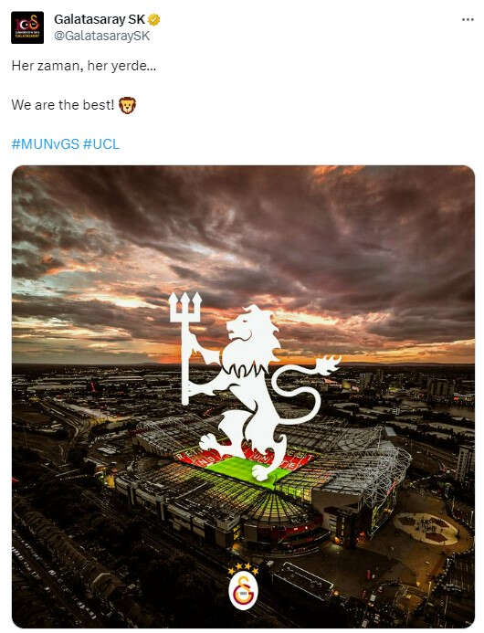 Galatasaray yaptığı paylaşımda Manchester United'ın armasında yer alan tırmık tutan şeytan figürünü değiştirdi. Old Trafford'un çimleri üzerinde yükselen bir aslanın tırmığı tuttuğu görsel, "Her zaman, her yerde..." ifadeleriyle paylaşıldı. Gönderi kısa sürede binlerce beğeni aldı.