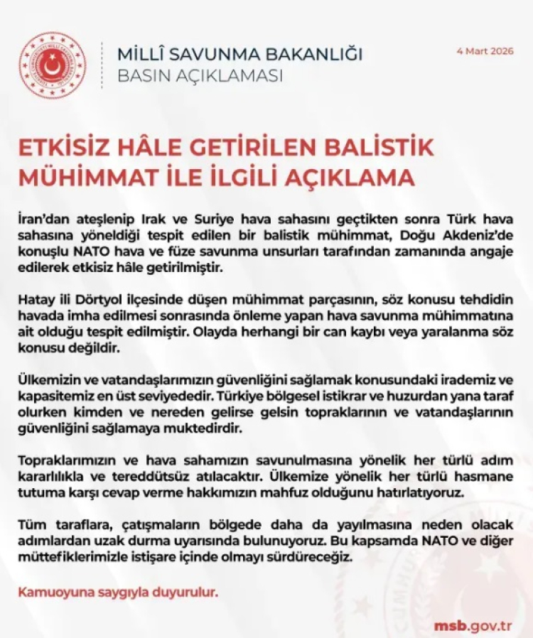 Açıklamada, mühimmatın Türk hava sahasına girmeden önce tespit edilerek imha edildiği, havada imha sırasında kullanılan önleyici füze veya savunma sistemine ait parçaların Hatay’ın Dörtyol ilçesindeki açık bir alana düştüğü bildirildi. Olayda yaralanma veya can kaybı olmadığı vurgulandı.