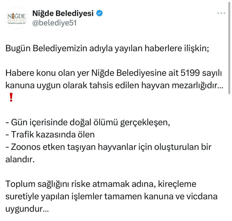 Sosyal medya üzerinde Niğde Belediyesi Hayvan Mezarlığı'nda çekilen görüntülerin yayılması üzerine, Niğde'de belediye tarafından köpeklerin uyutularak gömüldüğü iddiaları ortaya çıktı. Hayvan hakları savunucuları avukatlar aracılığıyla, Niğde Belediyesi hakkında suç duyurusunda bulunurken, Niğde Belediye Başkanı Emrah Özdemir, katıldığı bir televizyon programında görüntüleri doğrulayarak ne amaçla çekildiğini anlamadığını ifade etti. Özdemir açıklamasında: ''Gerçekten inanması zor ancak bilmiyorum görüntüyü çeken arkadaşlar hangi psikoloji içindeler. Çekim yapılan yer Niğde Belediyes Hayvan Mezarlığı. Her gün nasıl doğal olarak insanlar vefat ediyorsa, hayvanlarda doğal olarak hayatını kaybediyor. Trafik kazası, hastalık gibi nedenlerle hayatını kaybeden hayvanlar, belediyemize ait hayvan mezarlığında defnediliyor. Bizim arkadaşlarımız da bu şekilde ölen hayvanları gömerken, birileri gizli çekim yapıyor. Burada yapılan işlemler usülüne ve şartnameye uygundur. Bu görüntüleri çekenlerin amaçları nedir bilmiyorum. Niğde Belediyesi olarak bölgenin en iyi hayvan rehabilitasyon merkezine sahibiz. Hayvanları eğitip, sahiplendiriyoruz. Biz hayvanlar için bu denli çalışırken, bu görüntüleri çekerek bu şekilde servis edenleri de kınıyorum. Yasal haklarımızı kullanacağız.'' ifadelerini kullandı.