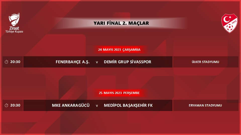 Ziraat Türkiye Kupası maçları heyecanla devam ediyor. Türkiye Futbol Federasyonu’nun yaptığı açıklamaya göre, Fenerbahçe-Sivasspor24 Mayıs Çarşamba günü, 25 Mayıs Perşembe günü ise Ankaragücü-Başakşehir maçları oynanacak. Ankaragücü- Başakşehir maçı Eryaman Stadyumu'nda oynanacak. Fenerbahçe ise Sivasspor’u konuk edecek. İki maçta saat 20:30’da başlayacak.
