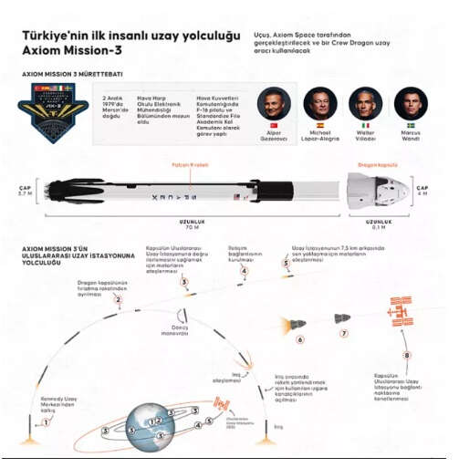 43 yaşındaki savaş pilotu Alper Gezeravcı, 14 günlük bir misyon için Amerika Birleşik Devletleri'ndeki (ABD) Cape Canaveral Hava Kuvvetleri İstasyonu'ndan Uluslararası Uzay İstasyonu'na (ISS) doğru havalanacak.