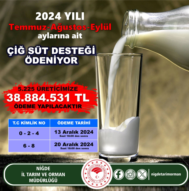 İlimizde 5.225 üreticimize 38.884.531 TL ÇİĞ SÜT DESTEĞİ ÖDEMESİ YAPILACAKTIR. T.C Kimlik No son hanesi 0-2-4 olan üreticilerimize 13 Aralık 2024 saat 18.00 den sonra T.C Kimlik No son hanesi 6-8 olan üreticilerimize 20 Aralık 2024 saat 18.00 den sonra hesaplara yatırılacaktır.'' ifadelerine yer verildi.