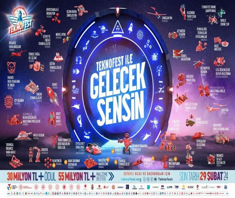 TEKNOFEST Havacılık, Uzay ve Teknoloji Festivali kapsamında düzenlenen dünyanın en büyük teknoloji yarışmaları için başvurular başladı. "TEKNOFEST ile Gelecek Sensin” mottosuyla prestijli yarışmalarda yüksek performans sergileyecek teknoloji tutkunlarına 30 milyon TL ödül ve 55 milyon TL’nin üzerinde malzeme desteği sağlanacak. Her yıl bir önceki yıla göre daha fazla yarışma kategorisinin açıldığı ve Türkiye tarihinin en büyük ödüllü teknoloji yarışmaları olan TEKNOFEST teknoloji yarışmaları bu yıl 46 ana kategori, 117 alt kategoride düzenlenecek. TEKNOFEST 2024 teknoloji yarışmalarına başvurular 29 Şubat 2024 tarihine kadar yapılabilecek.